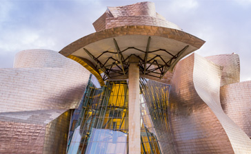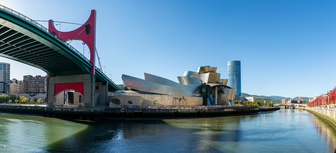Musée Guggenheim : Conçu en 1997 par l'architecte américain Frank Gehry, le plus beau monument de la ville a été à l’époque considéré comme une merveille d'architecture d'avant-garde et un symbole de la renaissance urbaine. Ce bâtiment emblématique fait de titane, pierre calcaire et verre, érigé sur les rives du fleuve, abrite des chefs-d'œuvre de l'art moderne et contemporain du XXe siècle, des expositions périodiques, des installations in situ et des formes multimédias d'expression artistique. Sa cour est dominée par des sculptures célèbres comme l'arachnéenne «Maman» de Louise Bourgeois et le «Puppy» de Jeff Koons. Grâce à la réflexion de la lumière, les collines et la rivière de Bilbao créent de magnifiques images sur les ailes métalliques ondulantes du bâtiment.