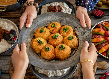 Offrez-vous une halte dans un salon de thé pittoresque ou un gahwa (café arabe traditionnel) pour vous initier au rituel du café arabe fort aromatisé à la cardamome et aux clous de girofle accompagné de fruits secs et de noix. Prenez un petit-déjeuner typique composé de baith tamat (œufs brouillés à la tomate, aux herbes et au safran) ou de chebab (crêpes chaudes faites de pâte fine fourrées au fromage aigre et au sirop de dattes). Cédez à la gourmandise avec les luqaimat (boules de beignet au safran, cardamome, sirop de dattes et sésame), la mahalabiya (crème de riz au lait parfumée à l’eau de rose et parsemée de cacahuètes), le knafeh (gâteau de semoule au sirop, fromage doux moelleux, cacahuètes et sirop de rose), ou encore le khanfaroosh (gâteau parfumé à la cardamome, au safran et à l’eau de rose), accompagné d’un thé ou d’un café.