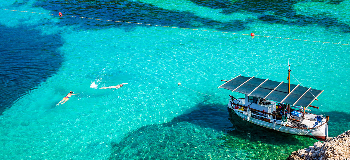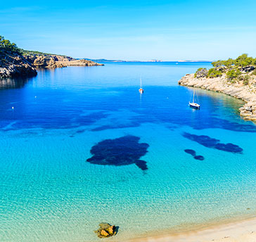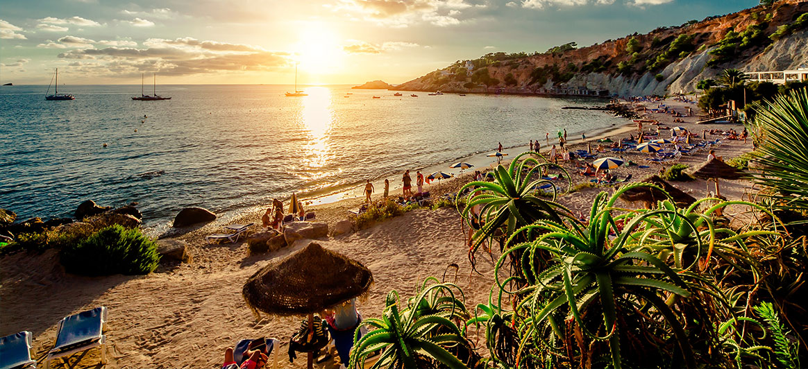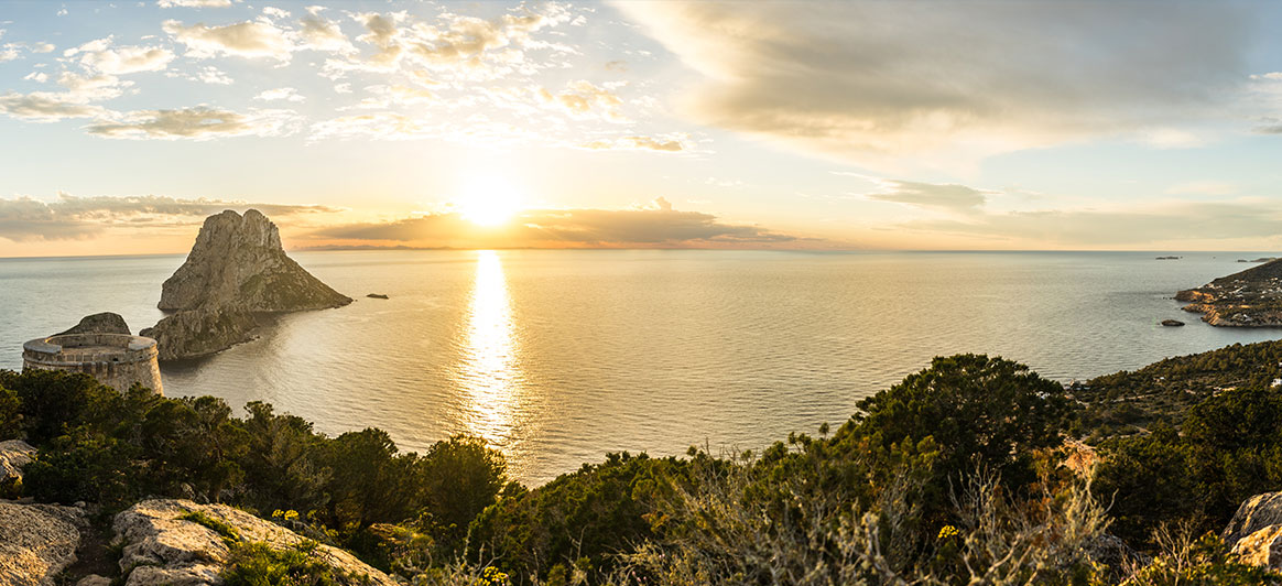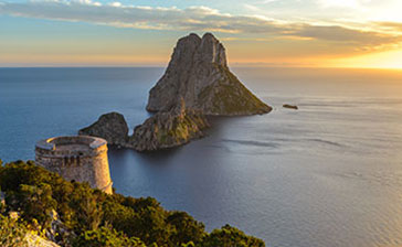 Cala d’Ηοrt : L'une des plus belles baies de la côte sud-est d'Ibiza, entourée de falaises et entourée de pins. Ce qui rend l'endroit encore plus enchanteur, c'est le coucher de soleil surplombant la mystérieuse île d’Es Vedrà, rocher calcaire escarpé, à 400 mètres au-dessus de la mer Méditerranée. L'île, où selon la légende vivaient les sirènes de l'Odyssée homérique, figure sur des centaines de cartes postales d'Ibiza.
