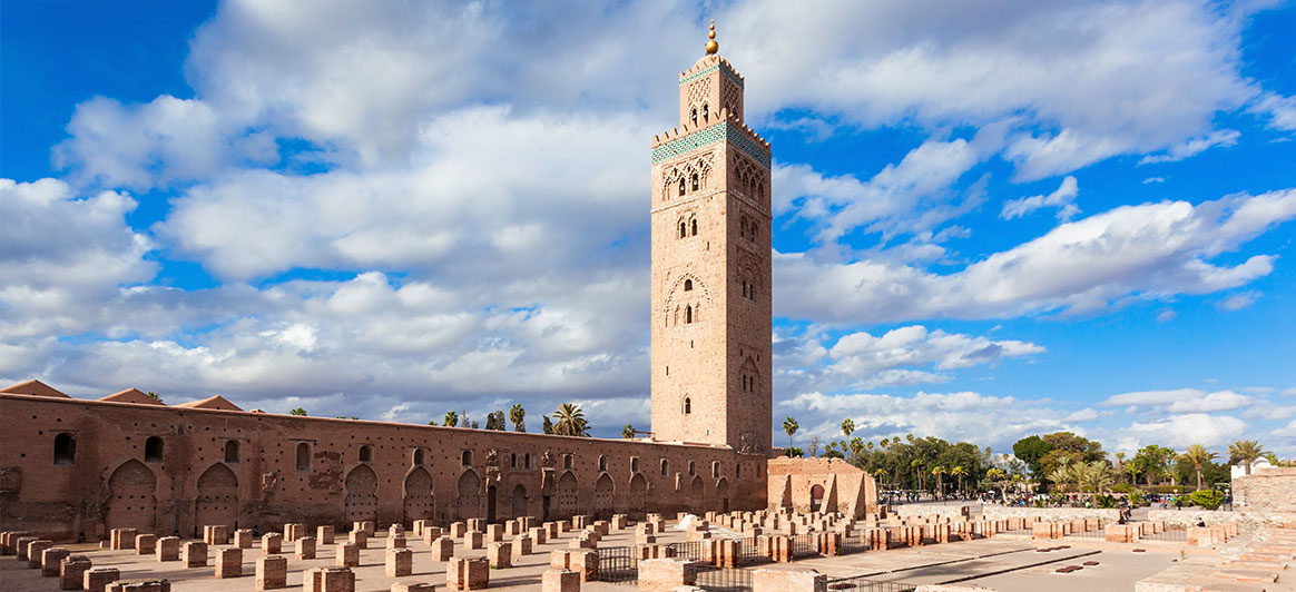 La mosquée Koutoubia : Son minaret , une tour majestueuse de 77 mètres qui s'élève au-dessus des immeubles et visible de tous les points de la ville, est le symbole le plus célèbre de Marrakech. Également connue sous le nom de « Mosquée des libraires » (les rues environnantes étaient autrefois bordées de librairies), cette impressionnante mosquée a été construite au XIIe siècle dans le style traditionnel almohade, en pierre rouge. Le sommet du minaret est surmonté de trois sphères de cuivre doré. Selon la légende, la dernière sphère est un don de l'épouse du sultan Yacoub El Mansour en guise d'acte d'expiation pour ne pas avoir observé le jeûne pendant le Ramadan.