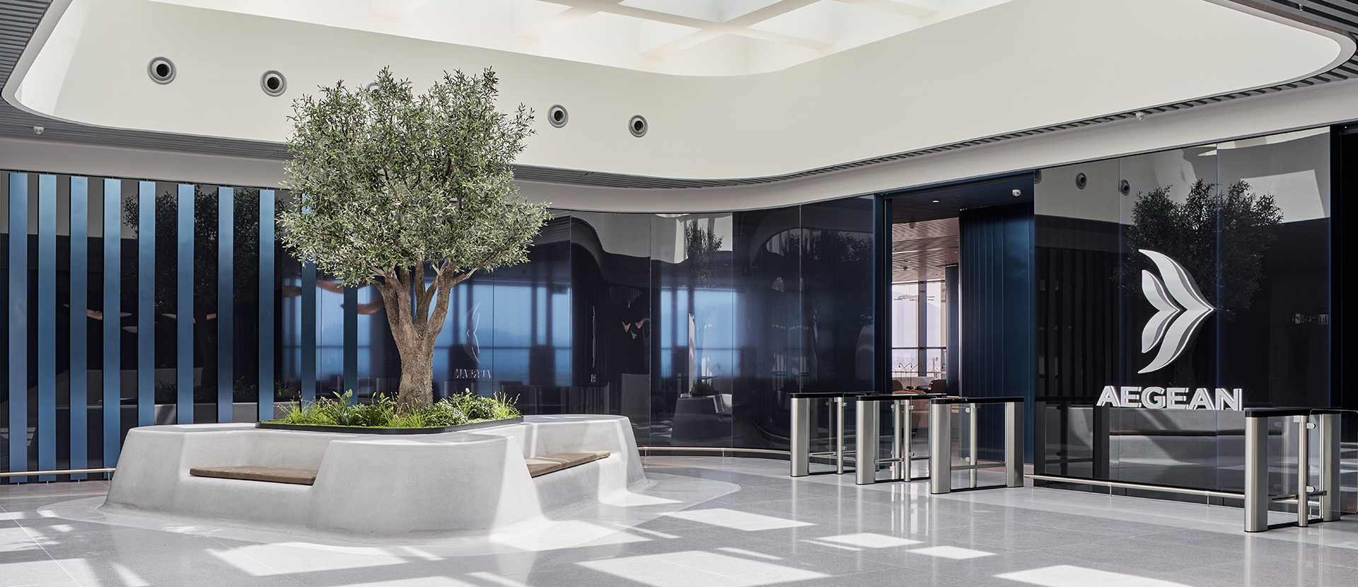 Sur une superficie de plus de 500 mètres carrés, il offre aux voyageurs une expérience unique dans une ambiance revigorante et détendue. Il garantit un espace calme à l'écart de l'agitation de l'aéroport avant le départ, ce qui met les passagers dans un excellent état d'esprit pour un vol parfait. Son design exclusif a été inspiré par l'architecture sculpturale humble des Cyclades, reflétant la technologie de pointe des avions, mais se concentrant avant tout sur le confort et la détente des visiteurs de tous âges.